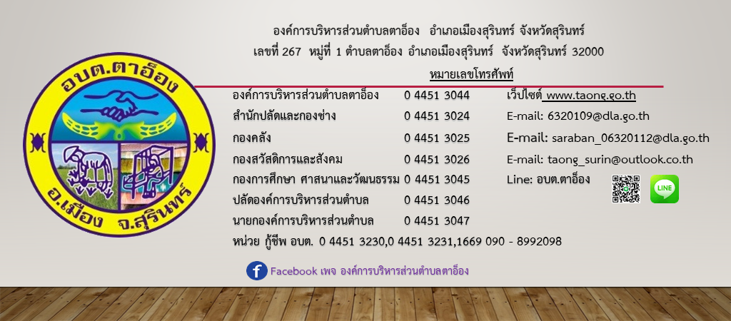 ติดต่อเรา ที่อยู่ /หมายเลขโทรศัพท์ องค์การบริหารส่วนตำบลตาอ็อง แผนที่ตั้งหน่วยงาน FaceBook องค์การบริหารส่วนตำบลตาอ็อง องค์การบริหารส่วนตำบลตาอ็อง Line องค์การบริหารส่วนตำบลตาอ็อง