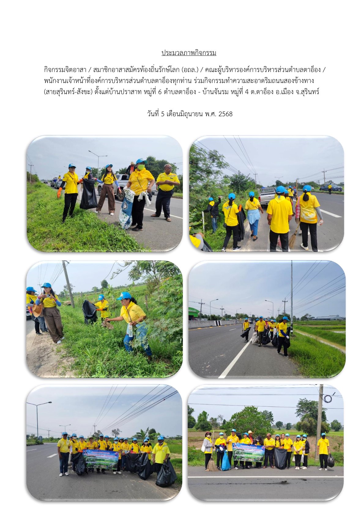 วันที่ 5 มิถุนายน 2568 กิจกรรมจิตอาสา / สมาชิกอาสาสมัครท้องถิ่นรักษ์โลก (อถล.) / คณะผู้บริหารองค์การบริหารส่วนตำบลตาอ็อง / พนักงานเจ้าหน้าที่องค์การบริหารส่วนตำบลตาอ็องทุกท่าน ร่วมกิจกรรมทำความสะอาดริมถนนสองข้างทาง (ถนนสายสุรินทร์-สังขะ) ตั้งแต่บ้านปราสาท หมู่ที่ 6 – บ้านจันรม หมู่ที่ 4 ตำบลตาอ็อง อำเภอเมืองสุรินทร์ จังหวัดสุรินทร์