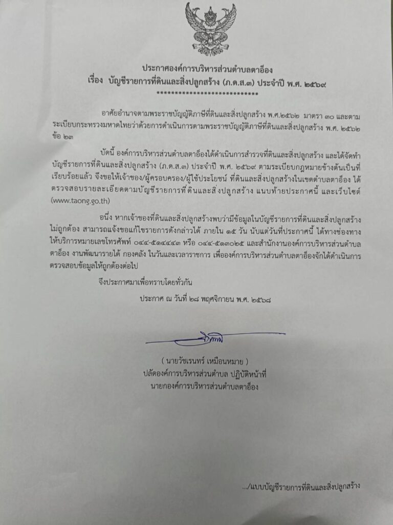 ประกาศองค์การบริหารส่นตำบลตาอ็อง เรื่อง บัญชีรายการที่ดินและสิ่งปลูกสร้าง (ภ.ด.ส.3) ประจำปี พ.ศ 2569 Published ,--วันที่ 28 พฤศจิกายน 2568 | By oil wi <<คลิกดูรายละเอียด>>ประกาส-ภ.ด.ส.3-2569-Exดาวน์โหลด Post Views: 11