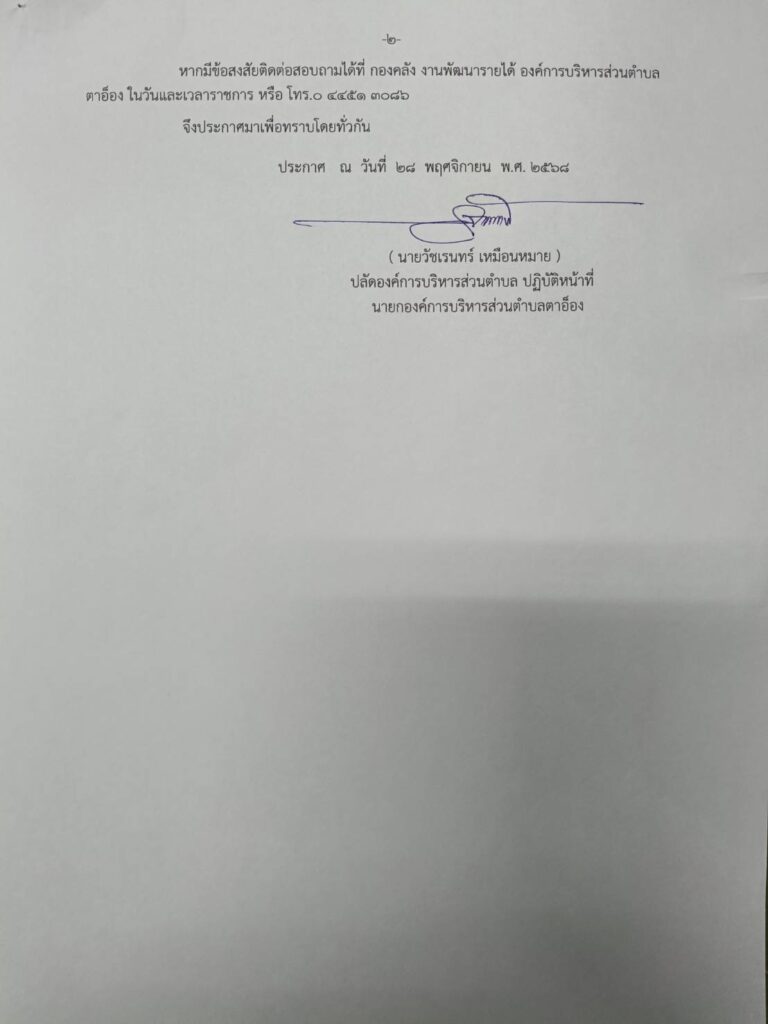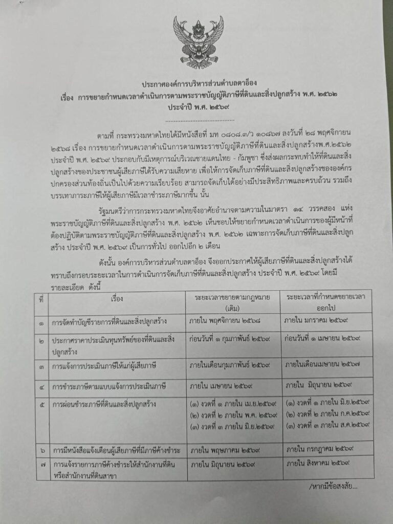 ประกาศองค์การบริหารส่วนตำบลตาอ็อง เรื่อง การขยายกำหนดเวลาดำเนินการตามพระราชบัญญัติภาษีที่ดินและสิ่งปลูกสร้าง พ.ศ. 2562 ประจำปี พ.ศ. 2569 Published ,--วันที่ 28 พฤศจิกายน 2568 | By oil wi Post Views: 16