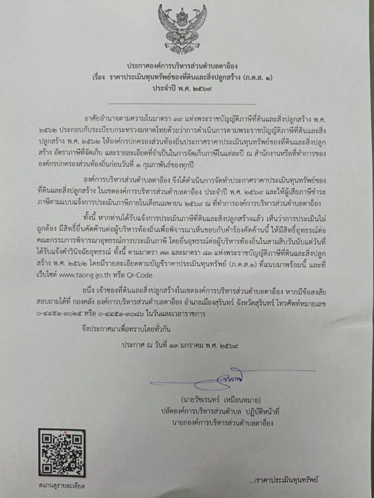 ประกาศองค์การบริหารส่วนตำบลตาอ็อง เรื่อง ราคาประเมินทุนทรัพย์ของที่ดินและสิ่งปลูกสร้าง (ภ.ด.ส. 1) ประจำปี พ.ศ. 2569 Published ,--วันที่ 13 มกราคม 2569 | By oil wi <<คลิกที่นี้>> ภดส.1ดาวน์โหลด สแกนเพื่อดูรายละเอียด Post Views: 38